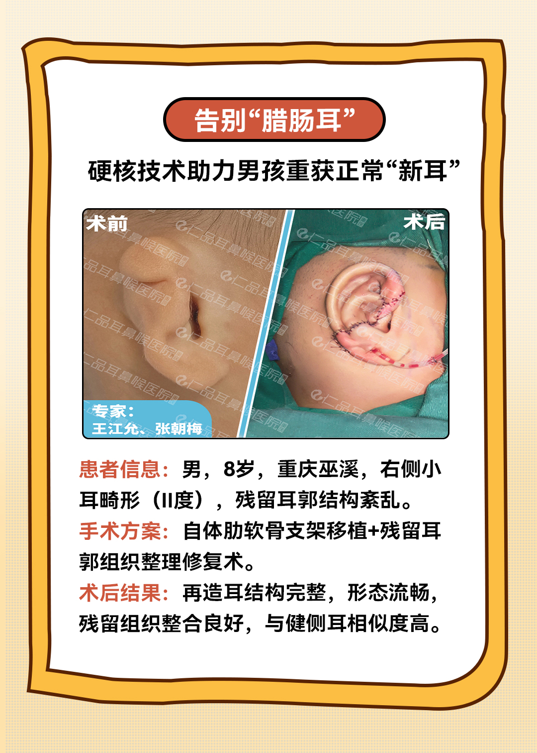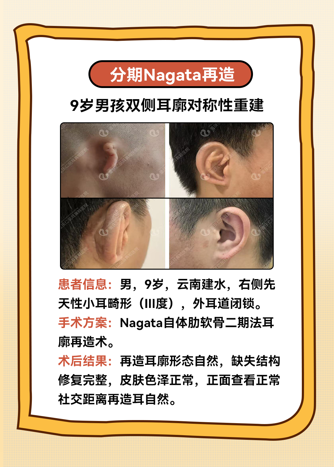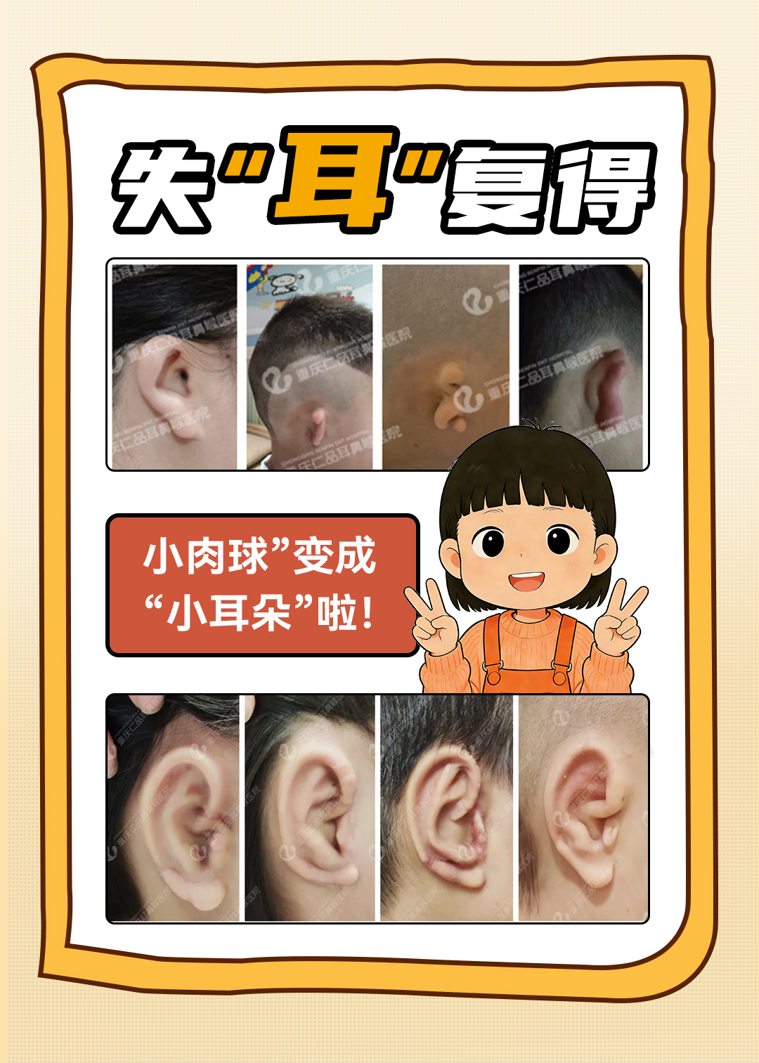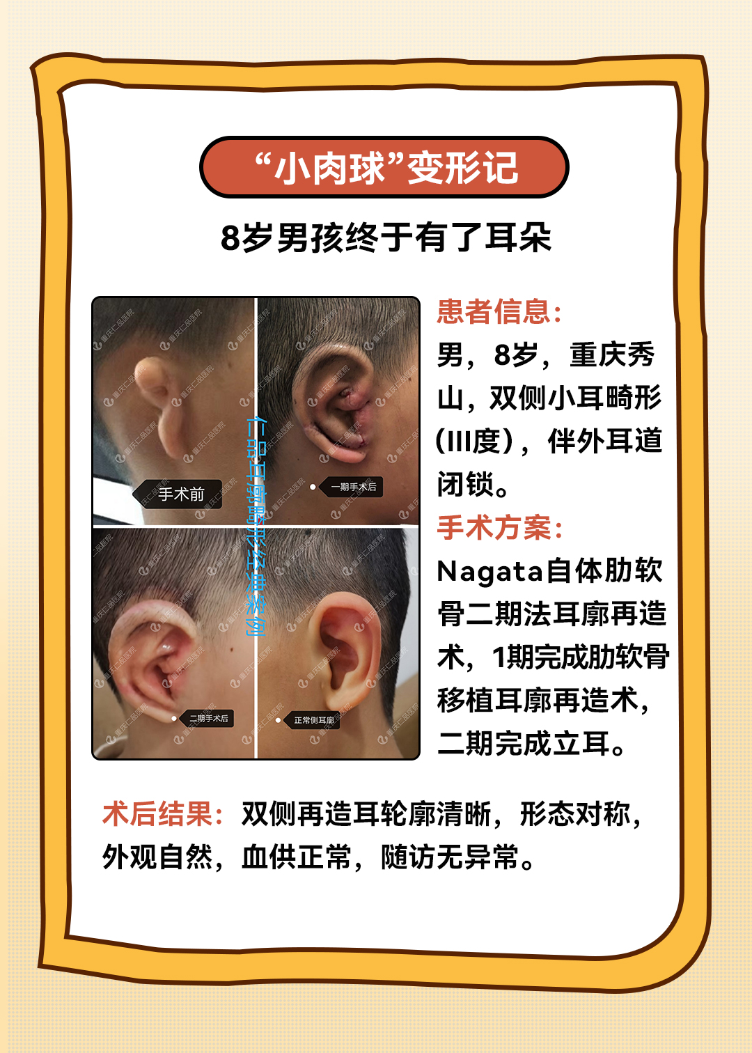 重庆仁品医院使用的是目前国际、国内主流的“二次法耳廓再造”,再造的耳朵形态逼真,而且有血供、有感觉,真正做到兼顾外形逼真和功能性。